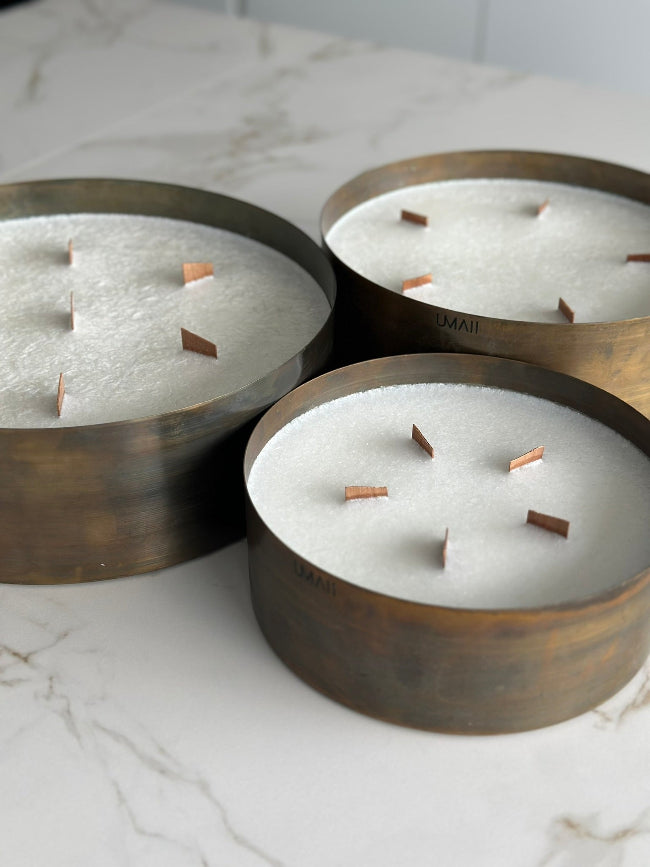 Geurloze handgemaakte kaarsen in België van olijfwas in gerecycleerde metalen bowls.