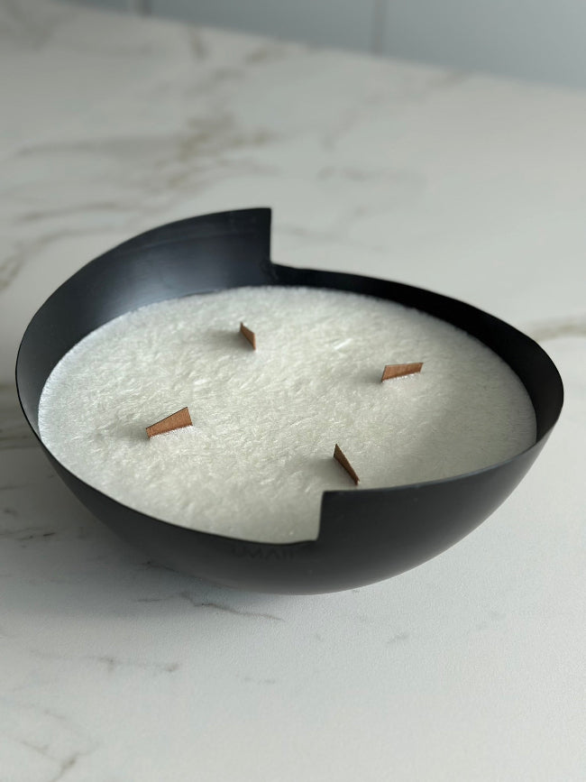 Geurloze handgemaakte kaarsen in België van olijfwas in gerecycleerde metalen bowls.